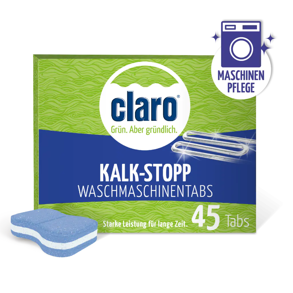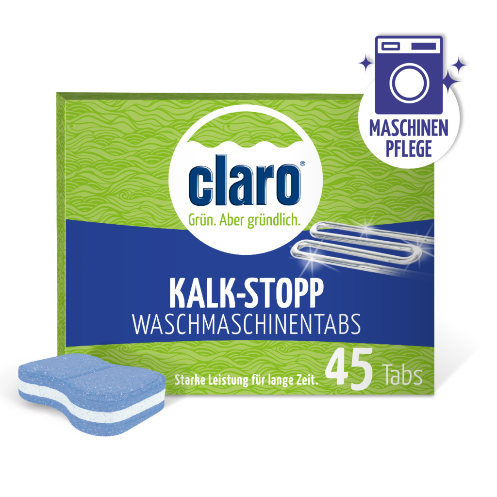 Die phosphatfreien claro Kalk-Stopp Waschmaschinentabs können nicht nur Kalk beseitigen, sondern noch vieles mehr! Durch die Kalklösung werden die Textilien weniger beansprucht und man braucht automatisch weniger Waschmittel.