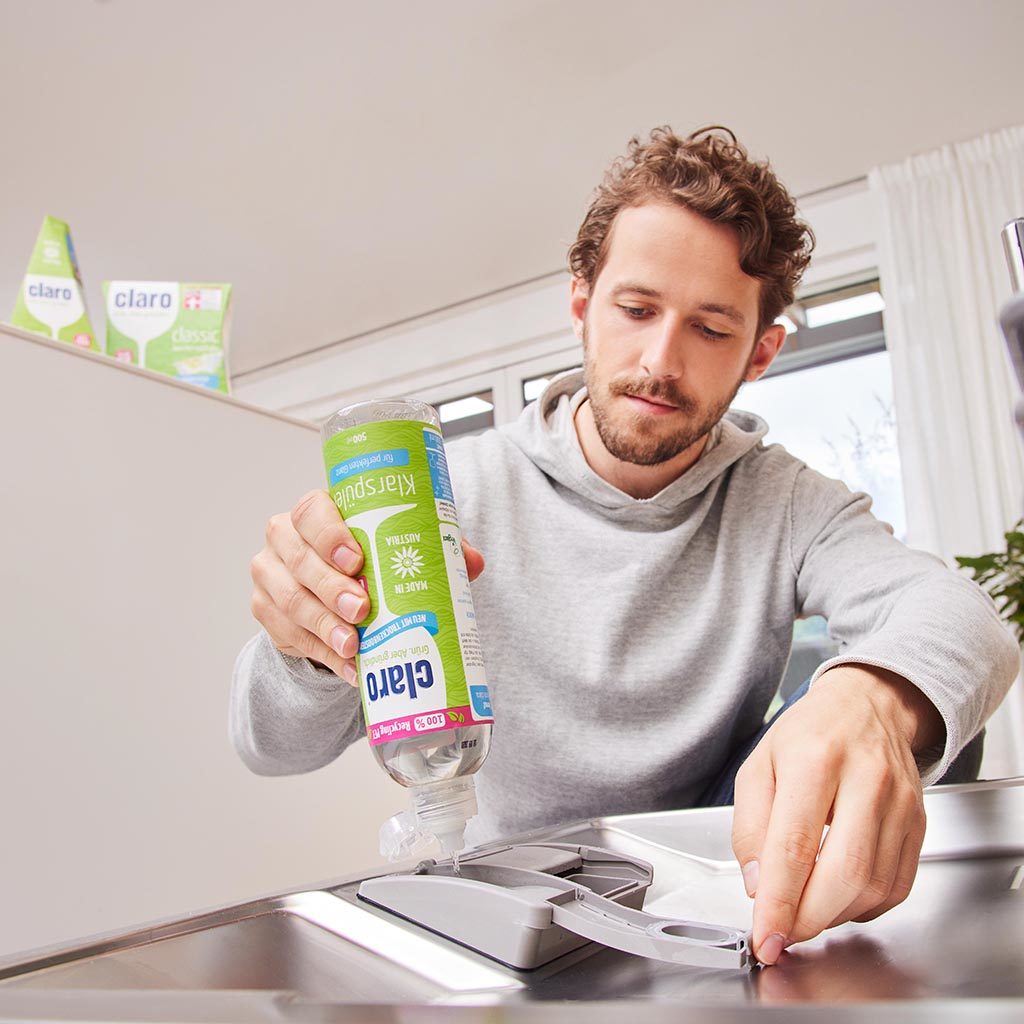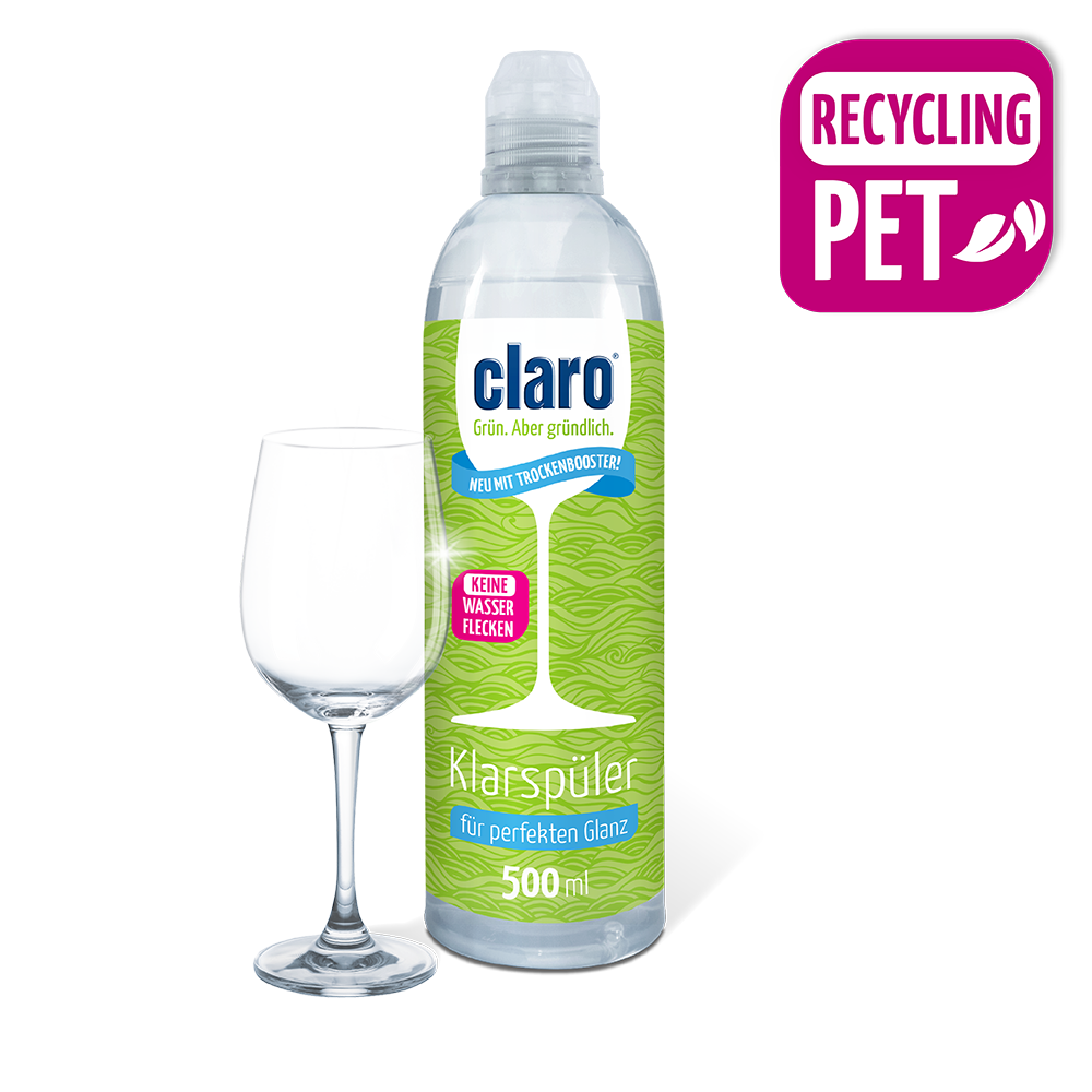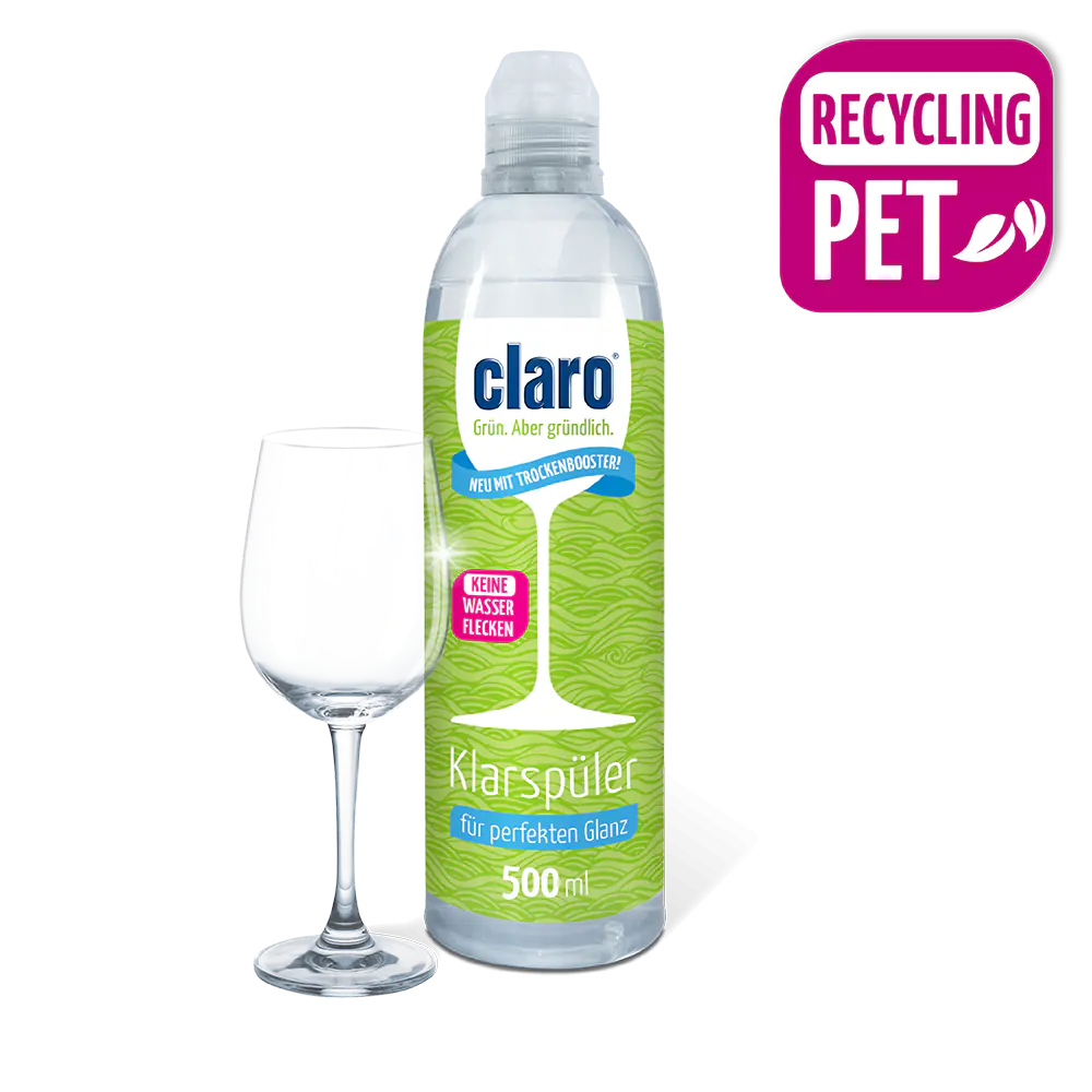 Der claro Klarspüler hat am Ende des Spülgangs richtig viel zu tun. Er sorgt dafür, dass das Geschirr trocken wird und in vollem Glanz erstrahlt, ganz ohne Wasser- und Kalkflecken. Der Glanzmeister beschleunigt den Trocknungsvorgang indem er die Wassertropfen spannt, sodass sie sich nicht am Geschirr festsetzen und er seine Glanzformel entfalten kann.