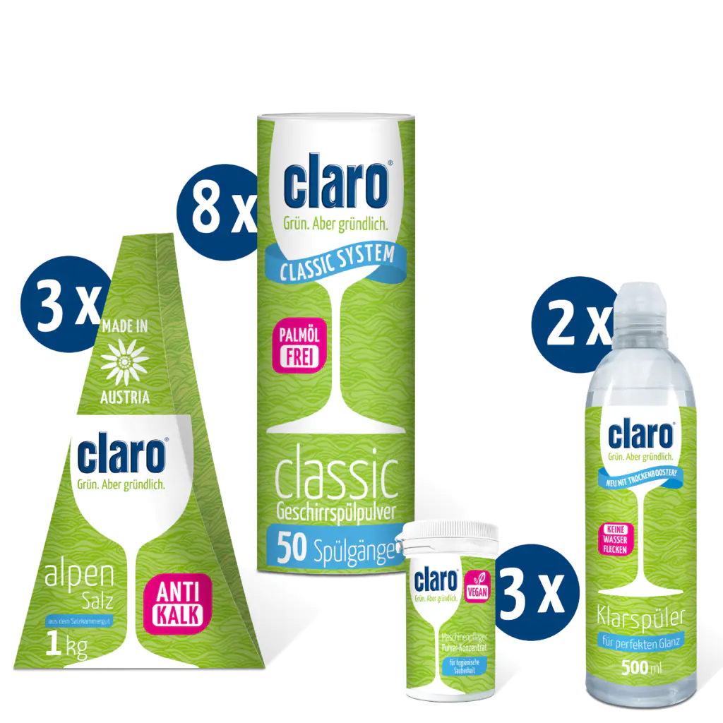 Das Pulver-Jahrespaket von claro garantiert 1 ganzes Jahr umweltfreundliches Spülen. Das claro Classic Geschirrspülpulver in der praktischen Runddose, das Alpensalz und der Klarspüler sorgen für eine rundum perfekte Reinigungsleistung. Für eine hygienisch reine Spülmaschine, frei von Fett und Kalk, gibt es den patentierten claro Maschinenpfleger.