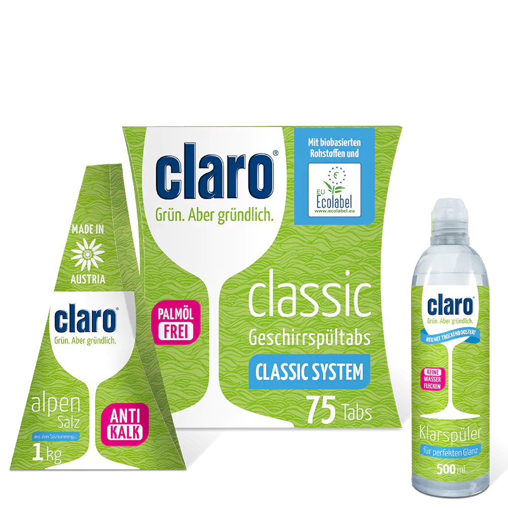 Unsere Classic Tabs spülen rückstandslos und sind somit unbedenklich für Mensch und Natur. Die patentierte wasserlösliche Folie ermöglichst einfaches Dosieren und vermeidet Plastikmüll. Das Alpensalz macht das Wasser weich und verhindert so Kalkablagerungen in der Maschine. Für einen glanzvollen Auftritt sorgt unser claro Klarspüler.