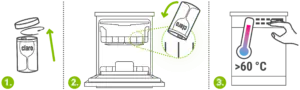 First, the alkaline cleaner dissolves fats and stubborn food residues. The separating layer between the metering chambers slowly dissolves and releases the acidic cleaner. Only then do the lime residues in the machine come on. We recommend to use the machine tool every two to three months.