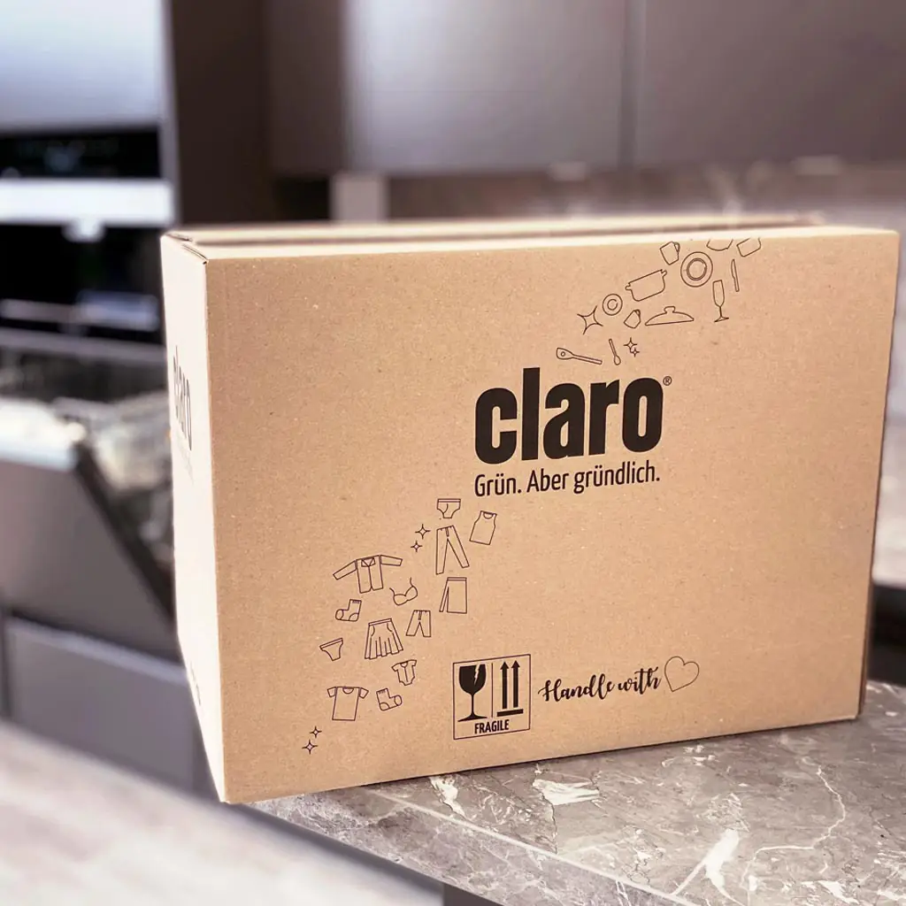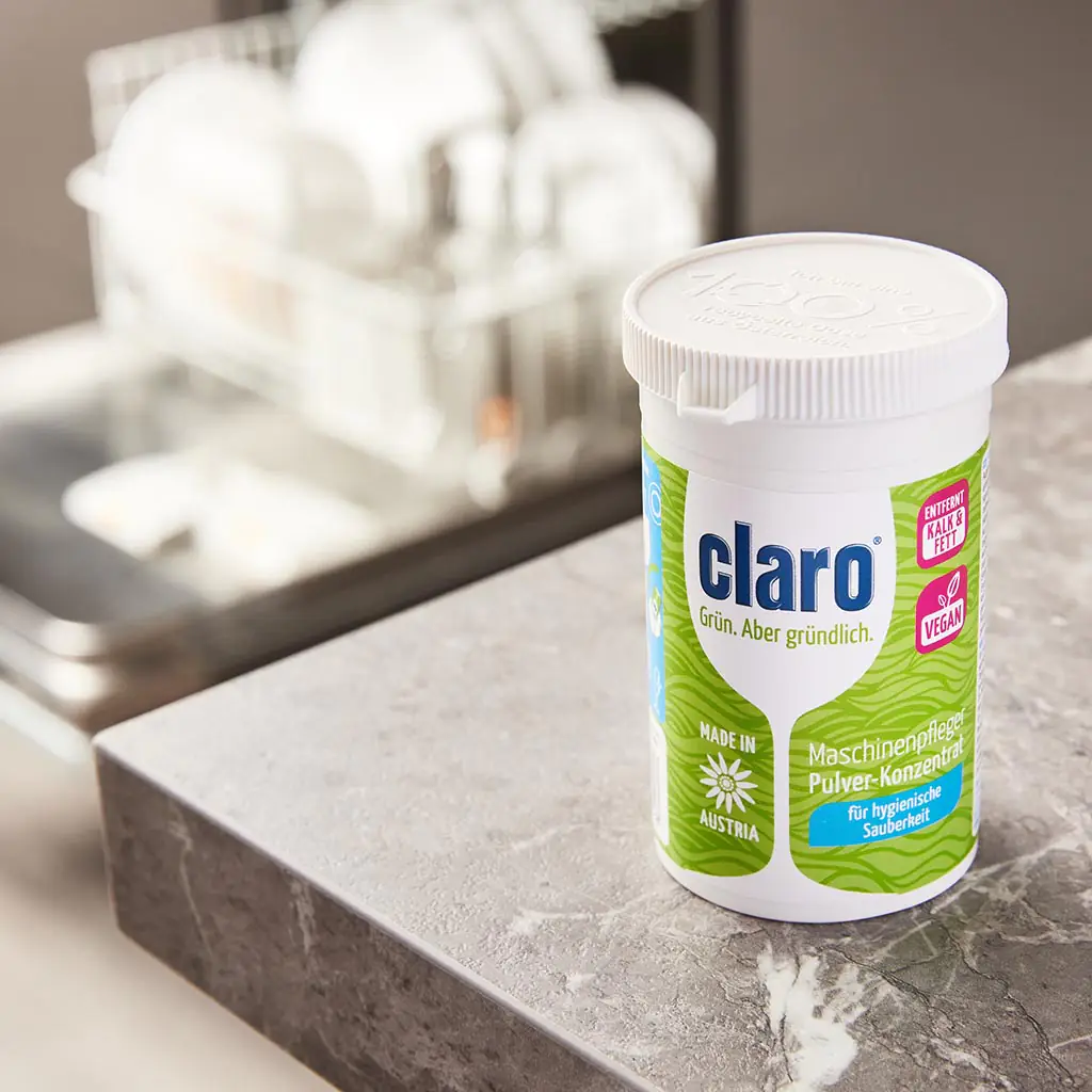 The water-soluble film is made of so-called polymers. The special feature of these polymers is that they are completely biodegradable. The polymers of the water-soluble film are degraded to carbon dioxide (CO2) and water (H2O). So, when they dissolve in the water, nothing remains – neither in the water, nor in the dishwasher and certainly not on the dishes. Thanks to our patented water-soluble film on the Tabs, here at claro we’re reducing plastic waste.