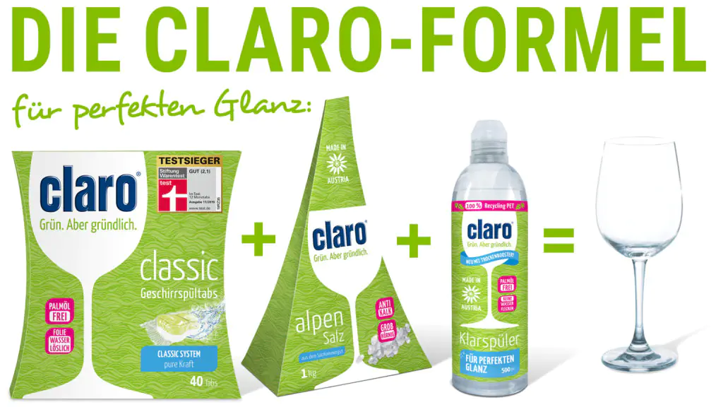 claro Classic Dishwasher Tabs release their full power in combination with claro Alpine Salt and claro Rinse Aid. One tab per rinse cycle, in its water-soluble foil, is enough to make your dishes radiantly clean again.